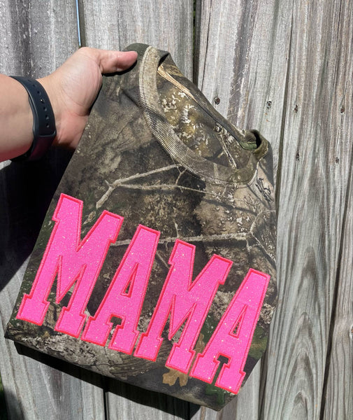 Realtree Camo Neon Pink Mama Glitter Applique Embroidered T-Shirt